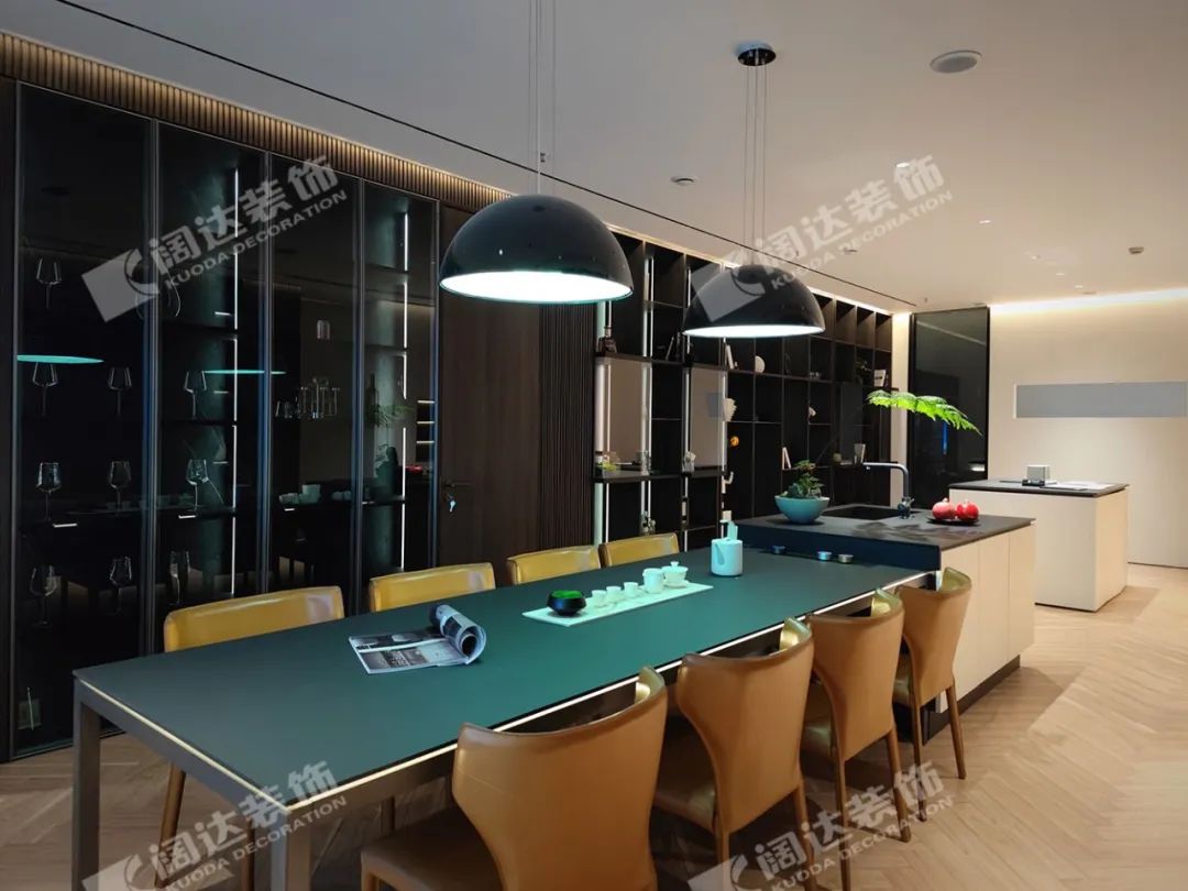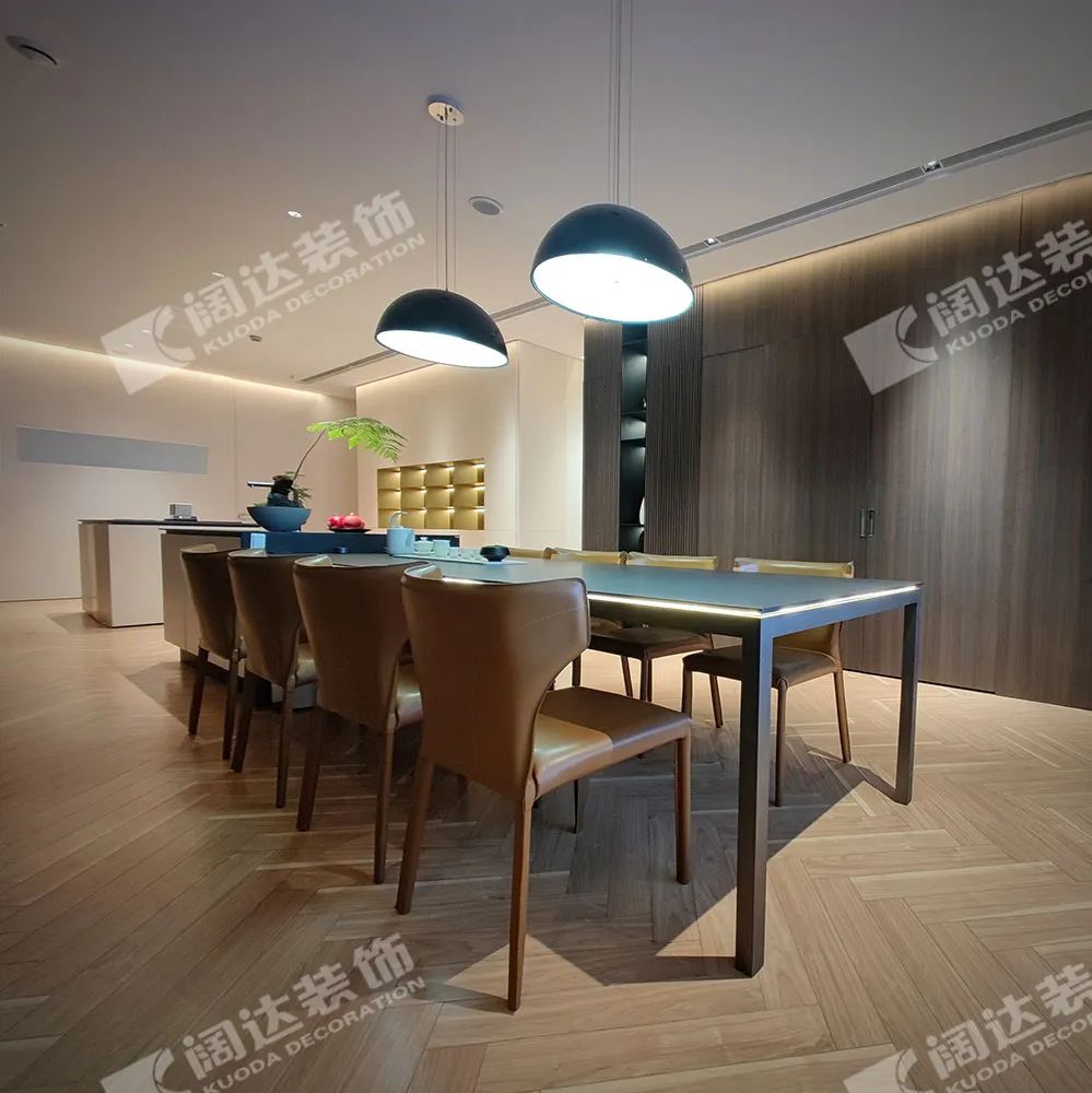 社交洽談區(qū)域采用當代最流行的膚感飾面制作一體化島臺桌面,既提升品質(zhì),又有觸碰島臺桌面時的舒適感,在餐桌的前后分別有大面積的玻璃酒柜和可封閉式西廚操作臺,桌面邊上采用軌道插座,實用的設(shè)計,滿足了用餐和辦公的雙重需求。