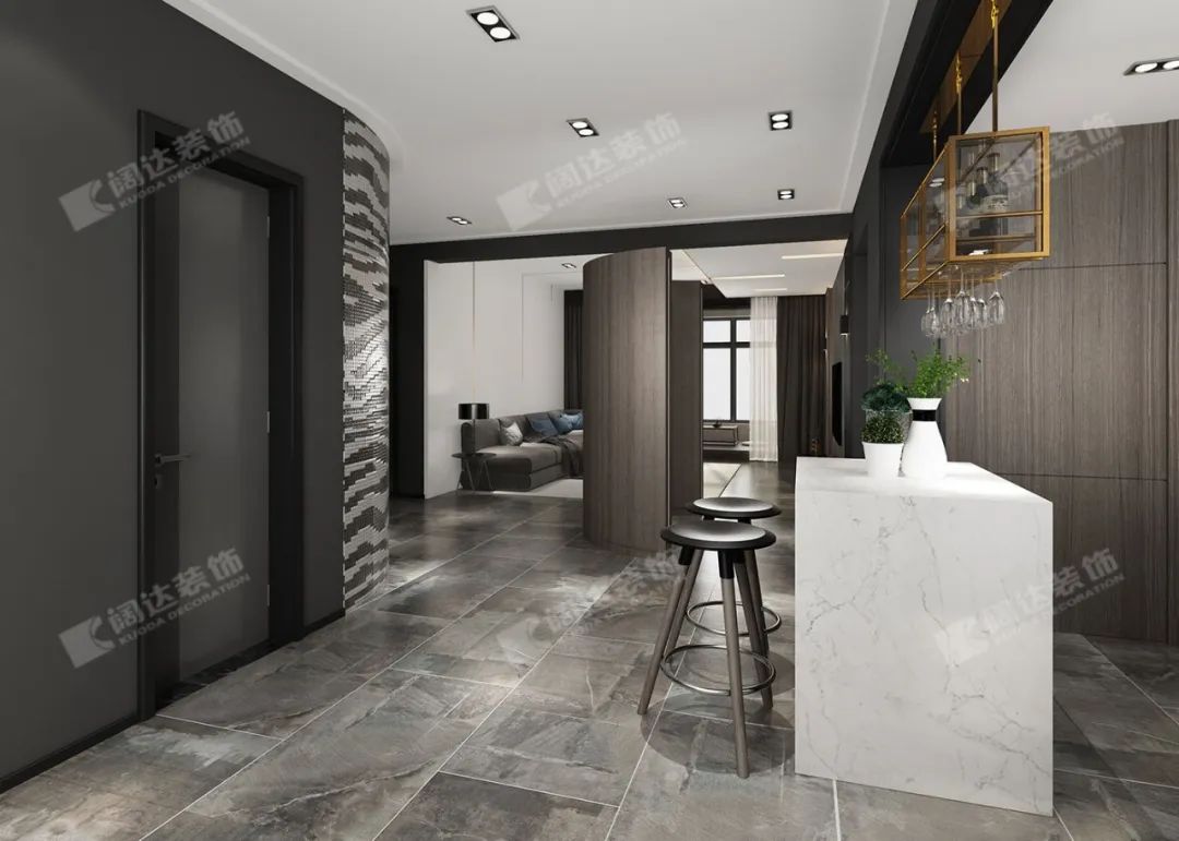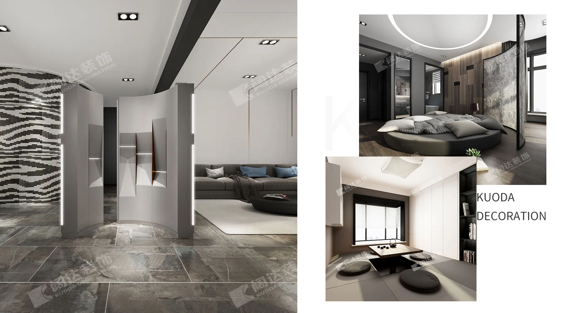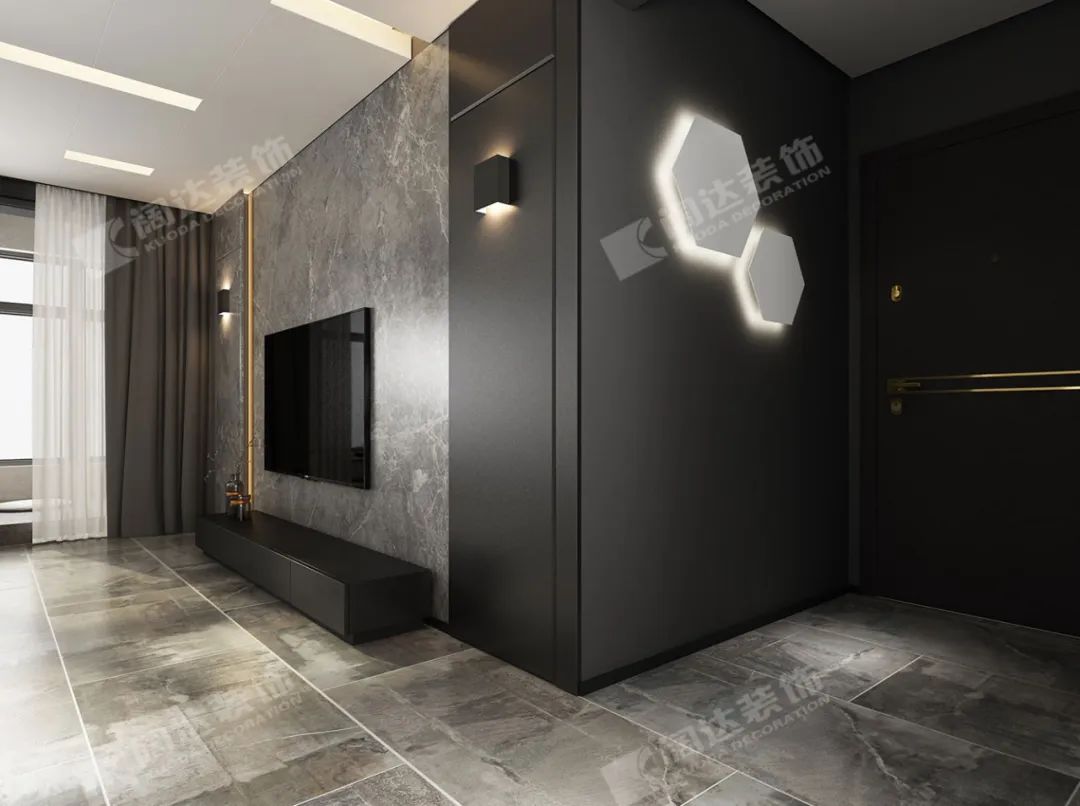 為了滿足業(yè)主大淋浴房的需求,客廳做出一個(gè)馬賽克飾面弧形墻,在擴(kuò)大淋浴區(qū)面積的同時(shí),形成了一道獨(dú)特的風(fēng)景線。