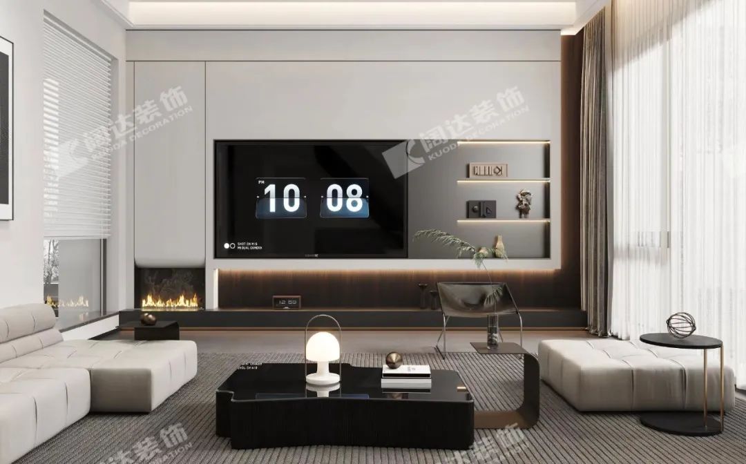 客廳電視背景墻:運(yùn)用簡約、當(dāng)代的手法去布局,借以保持空間的質(zhì)感,外表平靜,卻承載了生活里的豐富。像是藝術(shù)家康定斯基在畫布上自由地發(fā)揮想象空間。