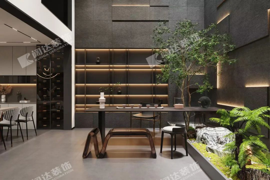 地下室茶室:設(shè)計,源于生活,更優(yōu)于生活。將自然與室內(nèi)結(jié)合,適當(dāng)增加綠植,不僅增強(qiáng)了空間與自然的溝通和互動,也緩解了地下室相對閉塞的通病,有了細(xì)致與粗獷的反差,為生活增添一些新鮮感。