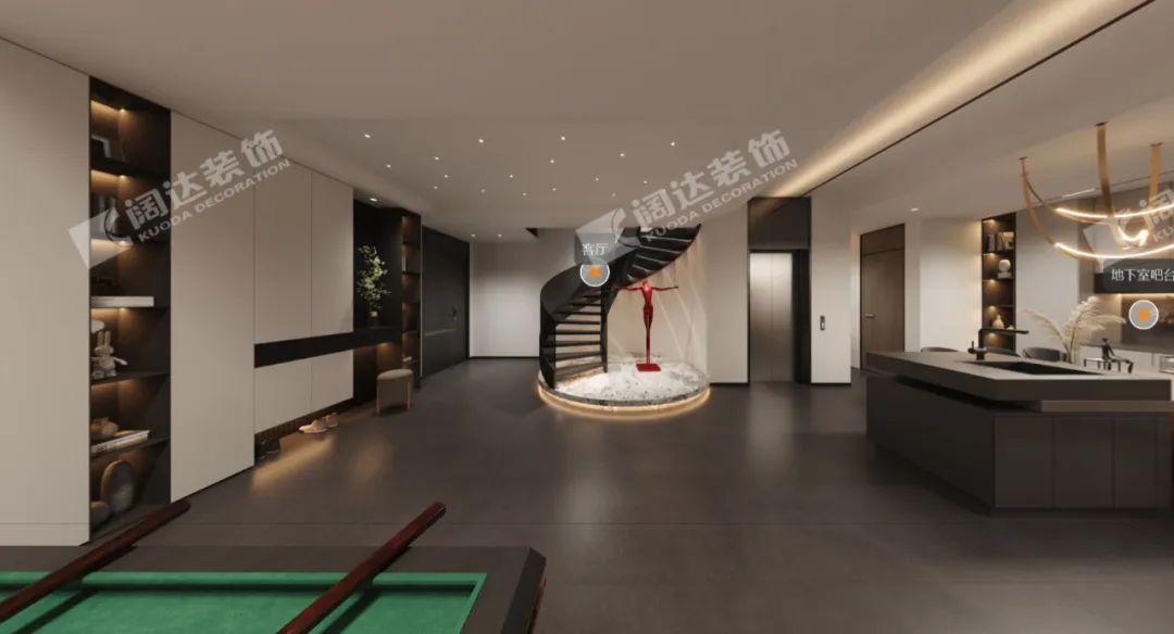 地下室入戶玄關(guān):從地下車庫進(jìn)入室內(nèi),儲物柜與換鞋區(qū),被精心地設(shè)計成一處自然景觀,搭配星空頂,讓家更添藝術(shù)氣息與夢幻感,鋼結(jié)構(gòu)的旋轉(zhuǎn)樓梯也保證了地下室的通透性和呼吸度。“回歸本真安寧的生活,從家開始。”