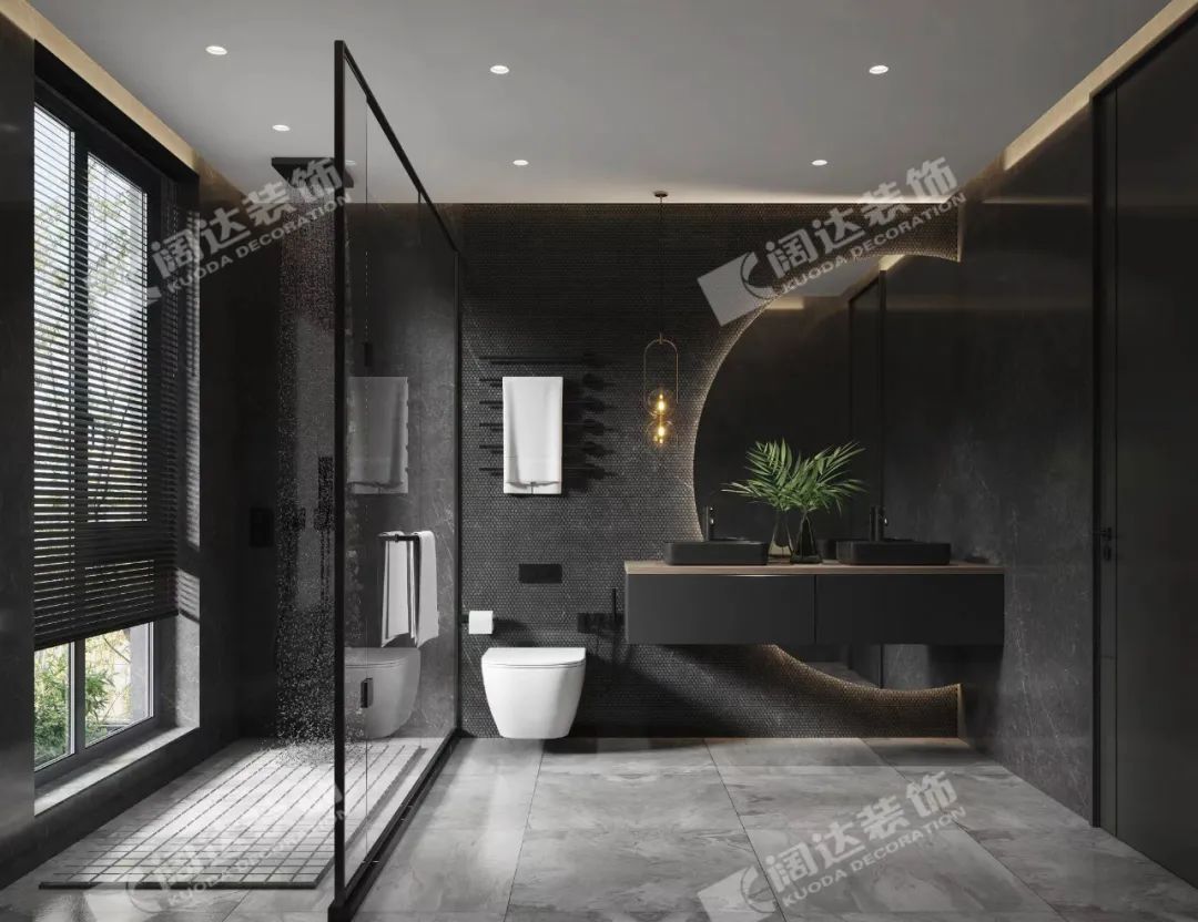 主衛(wèi):落地窗引入光線,以光為媒介,在黑色空間交錯、吸引。各式燈光,交織譜寫,跳躍多變。黑色和燈光的相互碰撞,就像我們體內(nèi)潛藏著兩個靈魂,好似對立,又互相融合。