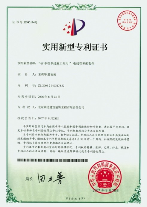 闊達4F單管單線擁有中華人民共和國知識產權局頒發的發明專利證書。