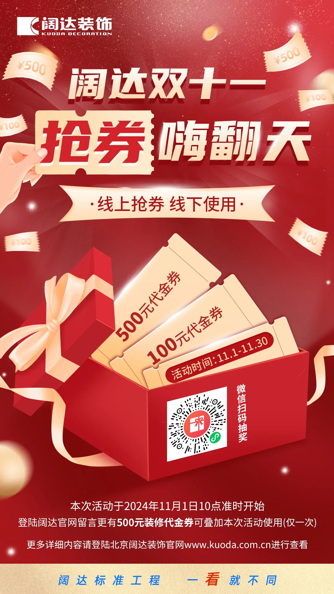 3、11月8日10點至11月30日可前往闊達官方授權門店進行預約裝修,享受優惠券抵扣。